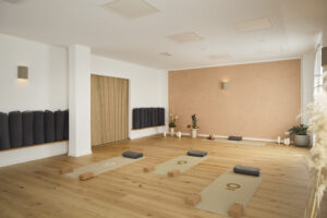 Der Raum bietet Platz für bis zu 12 Yogamatten, wobei bei Nutzung ohne Matten natürlich mehr Personen Platz finden.