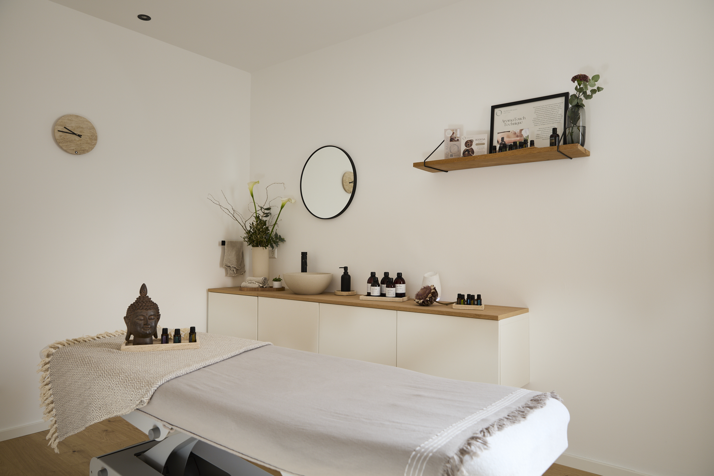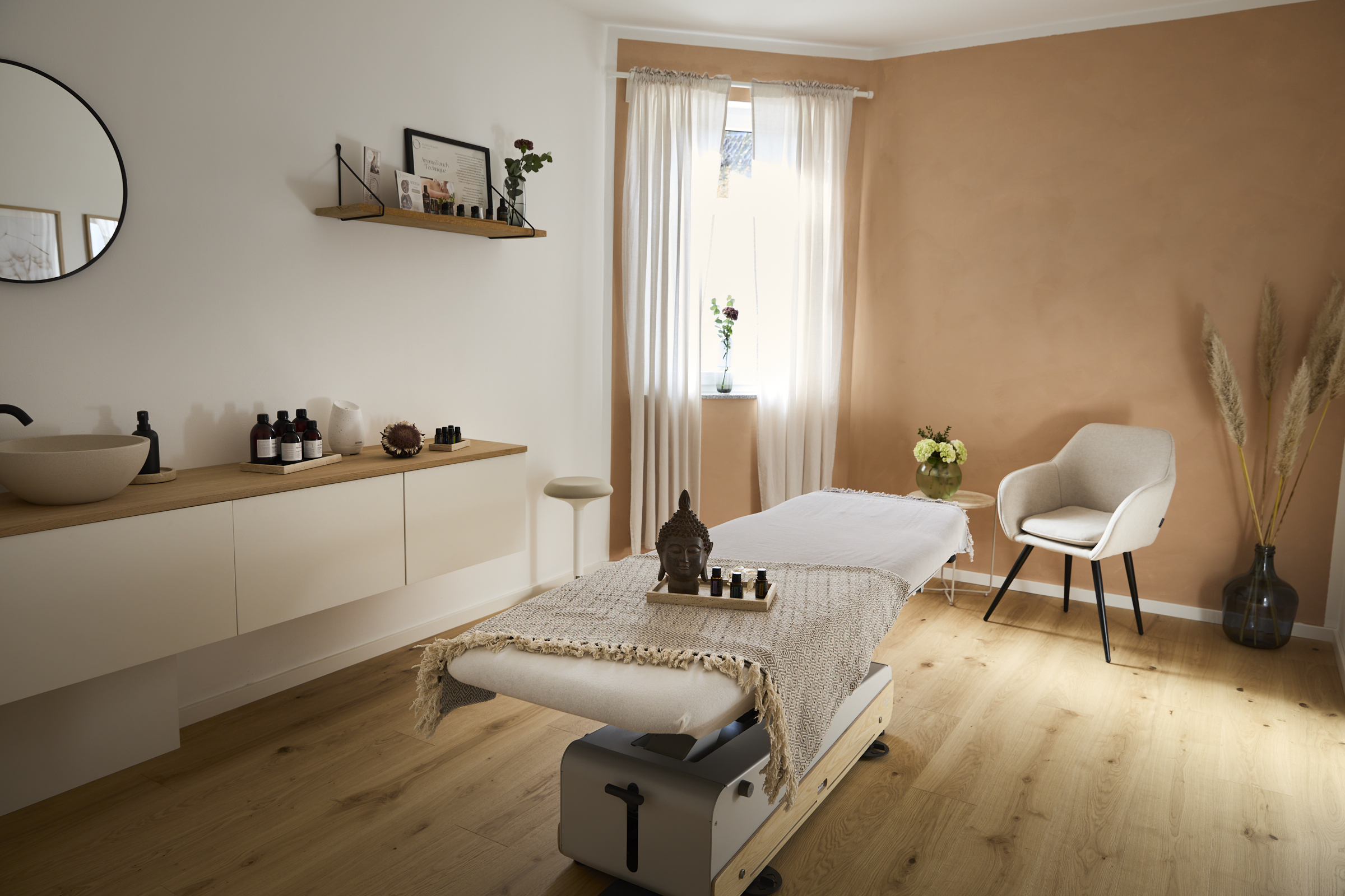 Der ruhige und helle Raum schafft eine entspannte Atmosphäre, in der sich deine Kunden wohlfühlen. Zur Ausstattung gehören eine elektrische Behandlungsliege, ein Behandlungsstuhl, ein Waschbecken, Stuhl und Tisch sowie Lagerungsmaterial, Kissen und Decken. Für eine angenehme Atmosphäre sorgt außerdem eine Music Box, Diffuser und weitere Annehmlichkeiten.