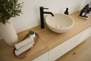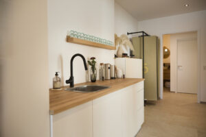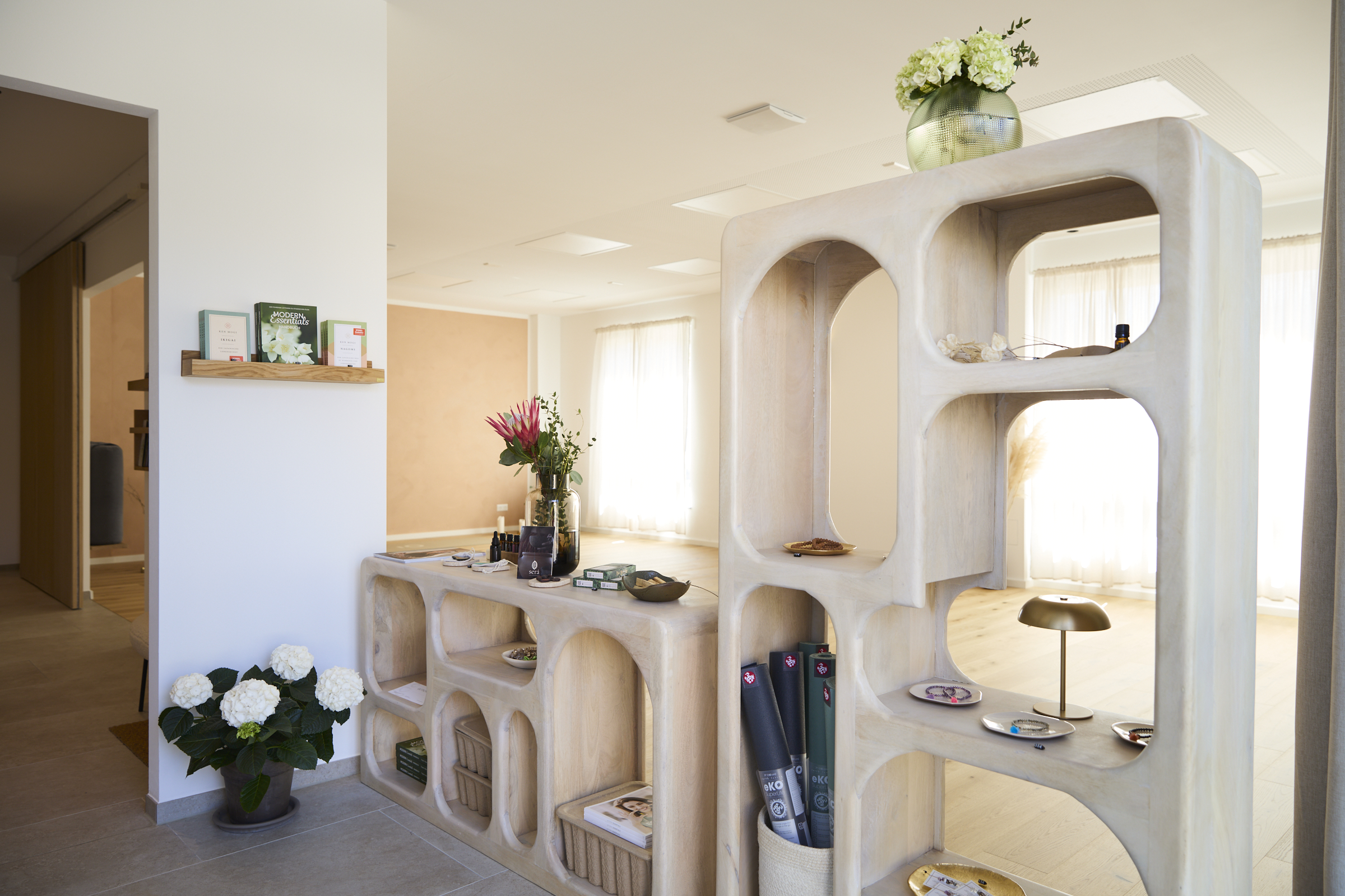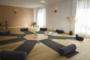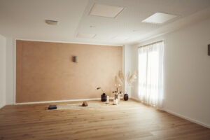 Das Studio wurde im März 2025 komplett kernsaniert und neu eingerichtet. Insgesamt umfasst es etwa 100 Quadratmeter lichtdurchflutete, helle Räume, die eine warme und liebevolle Atmosphäre schaffen. Bei der Einrichtung haben wir bewusst auf Naturmaterialien gesetzt: Der Kurs- und auch der Massageraum sind mit einem Eicheechholzparkettboden versehen, sowie einer Lehmfarbe an den Wänden, im Durchgangsbereich sorgt der Natursteinboden für ein angenehmes Raumklima. Dekorative Akzente setzen Travertinstein und Eichenregale, die den Raum harmonisch abrunden.